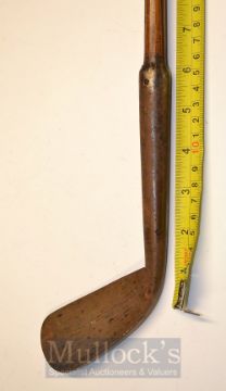 An Early Blacksmiths Made Concave Faced Driving Iron with 6” hosel and heavy deep knurling, the overall length measuring 44” still fitted with the original under listing