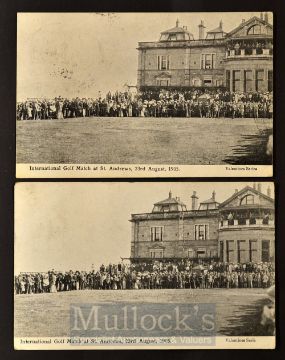 2x 1905 International Golf Match postcards- played at St Andrews on 23 August 1905 with both teams teeing off on the 1st tee-one with a vertical crease - both used, dated and franked St Andrews 1905.