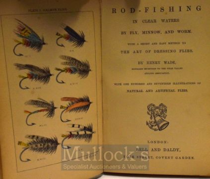 Wade Henry – Rod – Fishing in Clear Waters by Fly, Minnow and Worm. 1861 1st edition 12 hand coloured plates of flies, tackle and fish, original green cloth binding last few pages a little browned, book plate to inside cover, some splitting to spine