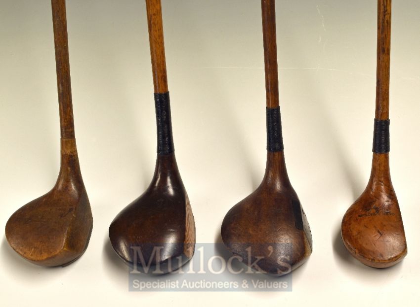4x Assorted Woods to include Leslie Mouland large head spoon with H shaped alloy sole plate and central fibre insert, together with a small head golden persimmon JH Taylor autograph brassie, a W Richie Worplesdon brassie, and a Wallace Ladies large head brassie