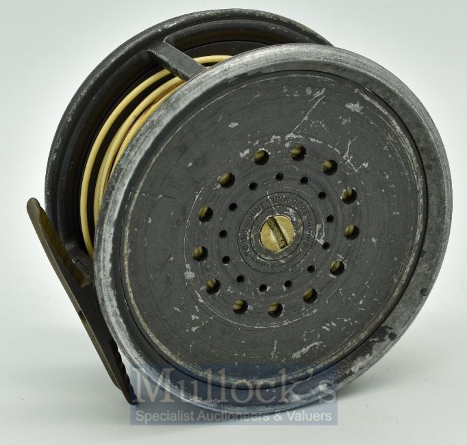 Hardy Perfect 4” post war alloy salmon fly reel – revolving alloy line guide, ribbed brass foot, rim tension regulator, black handle, - some paint wear