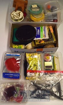 Selection of Fly Tying Accessories – To include large selection of fishing line, silks, boxes, hooks, cast carrier tin together with 10 tin fish napkin holders (Box)