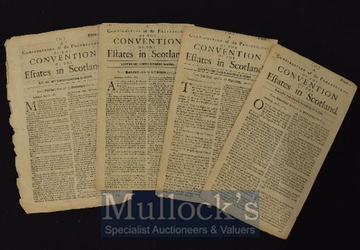 A Continuation of the Proceedings of the Convention of the Estates in Scotland – 1689 includes 4x single sheets, dates Mar 26, Apr 4, 19 and May 22, contents includes Ordered, A Warrant for Arming the Town of Glasgow, condition varies A/G overall (4)