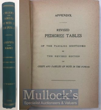 India & Punjab – Pedigree Tables of the Chiefs of Punjab A finely bound edition of the Appendix of Chiefs and Families of note in the Punjab, Civil Military Press, Lahore, 1911. This incredible volume is the pedigree table or family trees of all the important chieftains and royals of the Punjab, with details genealogy charts and family trees of each family sorted by region and districts, the majority of the pedigrees are fold out family trees showing ancestral lineages including of Ranjit Singh, Sukerchakkias, Sandhawalias, Patiala, Kapurthala, Nabha, Fairkot, Padhania, anandpur, kartarpur, Bagrian, Nakai, Majithia, Atariwala, Nalwa, Bedi, etc. Bound blue-green cloth with gilt titles to spine.