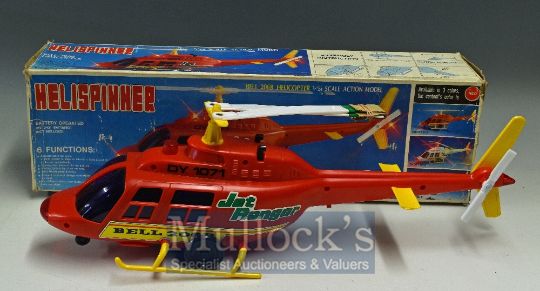 Wool Bro Battery Operated ‘Helispinner’ Bell 20B Helicopter a scale action model, in red with and yellow, appears in good condition, with original box