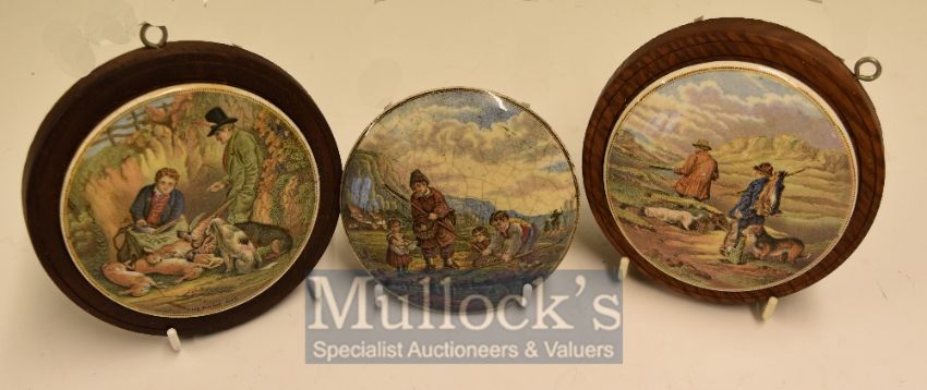 Prattware Ceramics Pot Lids: Three of pot lids having Sporting scenes The Game Bag, The Sportsman, The Fisherman two in wooden wall hanging mounts, pot lids 11cm (3)