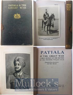India & Punjab – Patiala & The Great War The record of the Sikh State of Patiala’s forces in the First Word War, Compiled from Secretariat & other Records. 1st Ed., [viii]+91pp., portrait frontis. (of Maj.-Gen. HH The Maharaja of Patiala), 48 plates. Printed by the Medici Soc., For Private Circulation. The State’s assistance in the War plus the Maharaja’s services & brief records of the Rajindar Sikhs & Lancers (State Troops) in Gallipoli, Middle East & Mesopotamia. Excellent tipped-in photogravures of aforementioned units on service, of the Maharaja during a visit to France, of his unveiling of the Brighton Memorial (Indian Gate at the Pavilion), & of the Prince of Wales’s visit to Patiala in 1922. Orig. black cloth, gilt, boards