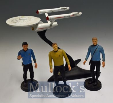 Franklin Mint Star Trek Enterprise Lamp - Cast from metal (Note missing it’s power source power pack) together with 3 12" Star Trek figures all having some damage (4)