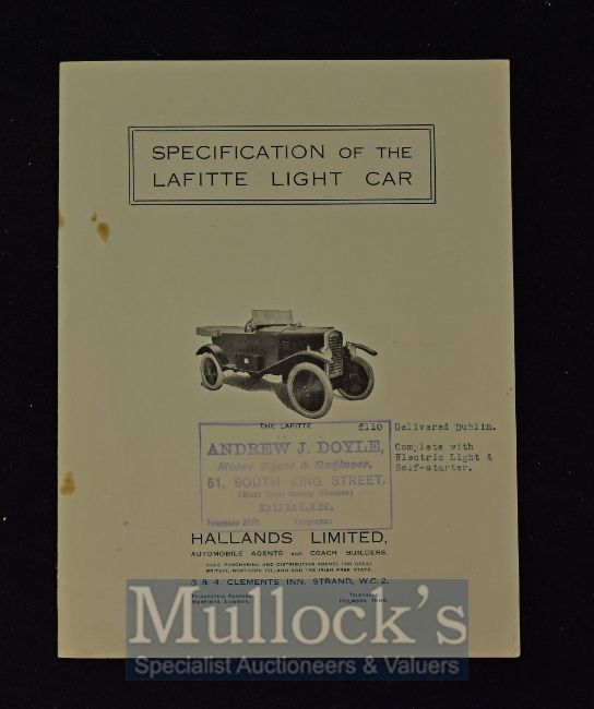 Lafitte Light Car For £100. Circa 1920s Sales Catalogue A4 page Brochure illustrating the Car of front cover and extensively detailing it over next two pages. Offered for sale for £100 by Hallands Ltd, Coach Builders, Strand, London. Semi Gloss paper, size 7½" × 10" folded