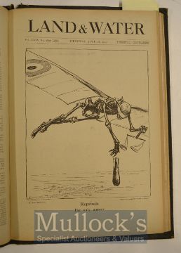 WWI Political Cartoons by Louis Raemaekers in ‘Land and Water War Series’ Vol XII 17 May 17 to 9 Aug 17, edited by Hilaire Belloc, 13 weeks, with front page illustrations by Raemaekers, drawn exclusively for Land and Water, full leather binding 27x25cm approx., scuffed and worn covers, internally clean overall