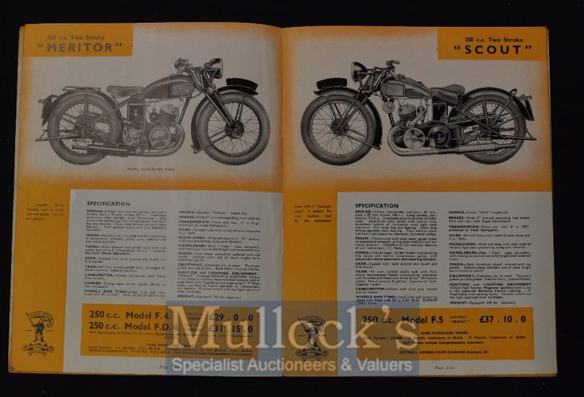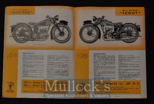 Excelsior Motor Cycles 1936 A fine 16 page Sales Catalogue, illustrating and detailing with prices their complete range of 9 machines; from 150c.c. Two Stroke for £24.5s.0d to 500 c.c. Manxman for $40. Made in Tysley, Birmingham. Printed on fine semi-gloss paper in illustrated card cover, size 7" × 9¼".