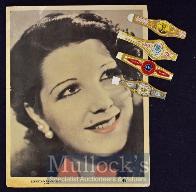 Original 8" x 10" promotional photo of a star "Libertad Lamarque" printed on card stock for "La Corona y Susini" cigars. Small 1" tear to one side +one 2 1/2" tear repaired on back. Presentable and collectable. Also 4 cigar bands for early to mid 20th century cigar brands, including "Londres Farach" and "Romeo and Julieta".