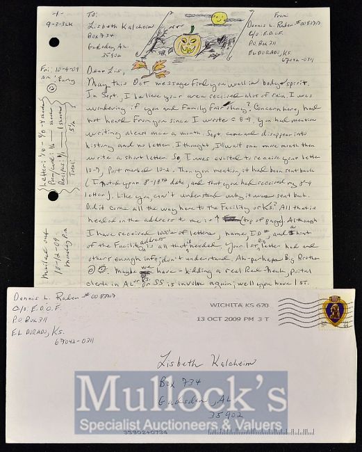 American Serial Killer – Dennis Rader (b.1945) Original Hand Written Letter – a hand written letter, 8pp, with erratic annotations and illustrations, in reply to a letter from a female, stating that he receives 1000s of letters and was wondering why her letter was late and to say hi to the family, comes with original envelope dated 2009, signed ‘Your friend Dennis’, plus a signed printed ‘Spring’ poem on a single sheet, coloured with illustrated front and rear, folded in the centre, with signature in red below the printed text (2), together with Dennis Rader (b.1945) Personal Calculator – the personal calculator with ‘Rader’ scratched to the top, with a Kansas Department of Corrections Inmate Property Receipt signed by Rader dated 2013, plus a signed photograph from Rader inscribed ‘The Mad-Non-Hatter’ dated 2014 and signed and inscribed the same on the reverse of the print (5) Note: Dennis Lynn Rader (b.1952) is an American serial killer who murdered 10 people between 1974 and 1991. Known as the ‘BTK Killer’ or the ‘BTK Strangler’, ‘BTK’ stands for ‘Blind, Torture, Kill’, which was his infamous signature. Currently serving 10 consecutive life sentences in Kansas.