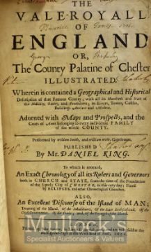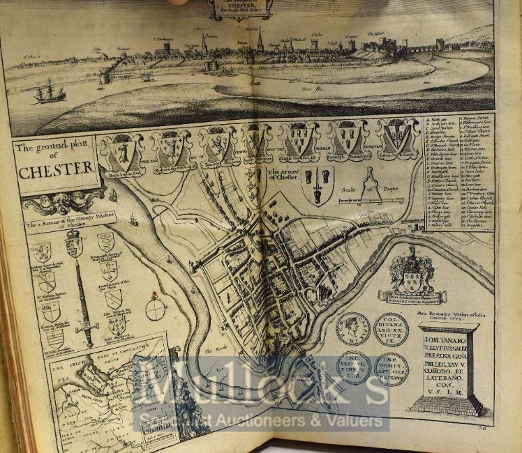 The Vale Royal Of England Or, The County Palatine Of Chester. To Which Is Annexed An Exact Chronology Of All Its Rulers And Governors Book 1656 Published by Mr. Daniel King. A First Edition of this scarce and important history. Engraved title, text title 8 pages of prelims 1 – 99, 5 pages of Table, 1 – 239, 10 pages, 1 – 55, title page, 1 – 5 pages. Additional engraved title, 2 double page maps/plans, 14 engraved plates (1 of which is folding, double page engraved plate) and several engraved illustrations within the text, one full page. A First Edition of this scarce and important and detailed history illustrated by Wenceslaus Holler, with maps and views, plus Coat of Arms of families of the county. Has been rebound in leather cover boards. Five raised bands, black title label and gilt to spine. Size 7¼" × 11½".