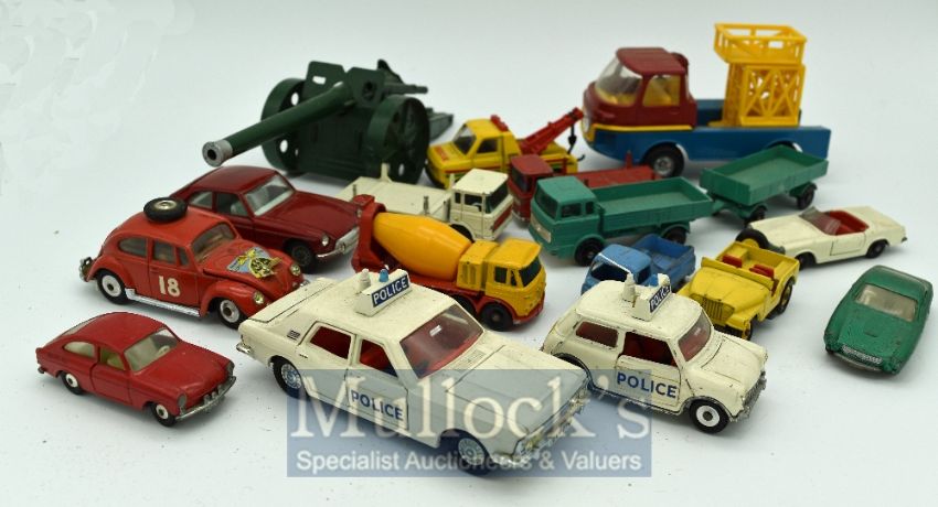 Selection of Diecast Car Toys – To include Dinky Ford zodiac Austin mini police cars, Corgi MGB GT, Volkswagen 1200 saloon, Matchbox regular wheels together with a Britain’s Gun