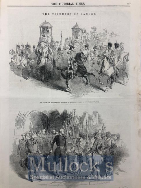India & Punjab – Maharajah Duleep Singh in 1846 An original antique engravings of the Pictorial Times of April 25, 1846 covering the First Anglo Sikh War, with engravings of the Triumphs at Lahore, The Maharajah Duleep Singh conducted by the British Officers to the Citadel of Lahore, and The Mharajah Dhuleep Singh restored by the Governor General’s Authority to his Palace.