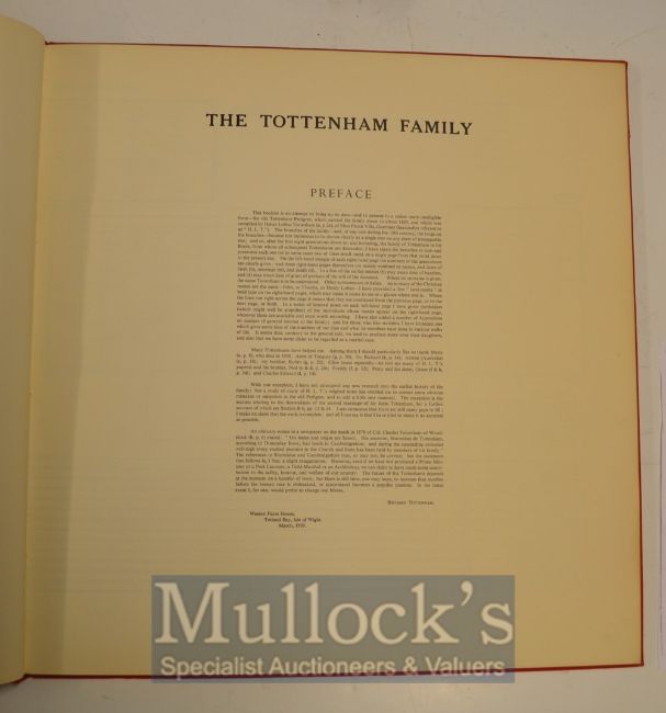 Isle of Wight – ‘The Tottenham Family Book’ includes details of ‘Pedigree of Tottenham’ printed on the Isle of Wight, Totland Bay, with notes from Sir George Richard Frederick Tottenham, playing cricket for the Europeans against the Indians at Madras, serving as a British Civil servant, the book published in 1959, with some varying notes included, bound in red cloth with coat of arms to front, appears in average to good condition overall