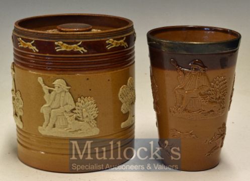 Royal Doulton – Doulton Lambeth Stoneware Pottery Tobacco Jar and Beaker the tobacco jar marked 7838 and ‘ds’ to bottom, the beaker marked ‘p’, with faint hallmark to rim, the beaker appears with one crack otherwise in good condition, the tobacco jar with lid, appears with no signs of cracks and in good condition (2)