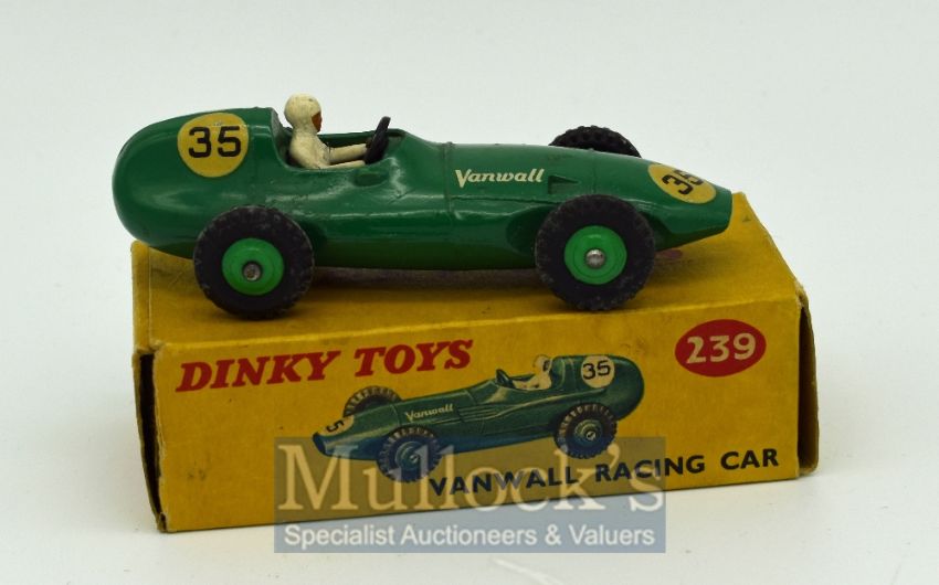 Dinky Toys 239 Vanwall Racing Car - green, silver trim, figure driver, mid-green ridged hubs with black treaded tyres, racing number 35 decals - Good still a bright example in a yellow and red carded picture box.