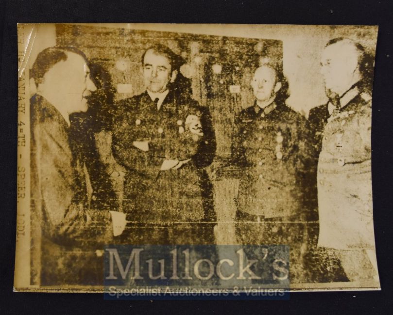 ‘A New Picture of Adolf Hitler’ Press Photograph notes to the reverse, ‘Radio Picture from Stockhol 9.1.45’ depicts Hitler with Speer, Jodle, Keitle and Ribbentrop taken at Hitler’s H.Q, in black and white, distorted, measures 20x15cm approx. Note photo sent by telegraph machine , developed by telegraph machine, there is no evidence of another telegraph photo of Adolf Hitler