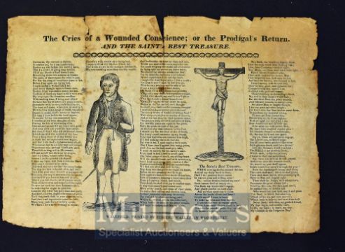 The Cries of a Wounded Conscience or the Prodigal’s Return and the Saint Best Treasure Broadside - with illustrations, Wakefield: Printed by Edmund Waller, in Wood-Street, measures 38x27cm approx. tears apparent, folds present