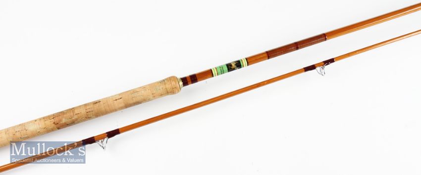 Fine Allcocks Lightweight Carp Split Cane Rod – 9ft 6in 2pc with Agate lined butt and tip guides, very clean 25 inch slim cork handle with alloy sliding ring reel fittings, good makers green, white, black and gold transfer label - appears unused in fitted cloth bag - butt section measures 55” and tip section measures 60”