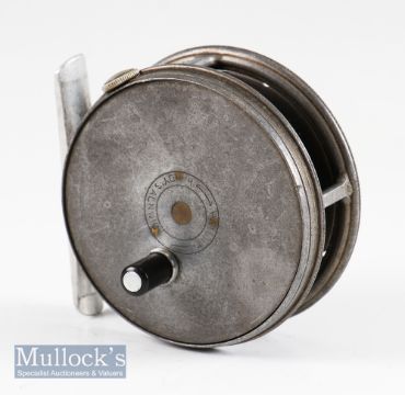 Unusual Hardy Bros Alnwick “The Perfect” alloy trout fly reel c.1921 – 3 1/8” dia, single check, smooth alloy foot stamped England, but note the position of the black composition handle – will look forward to hearing collecotrs thoughts on this one!!