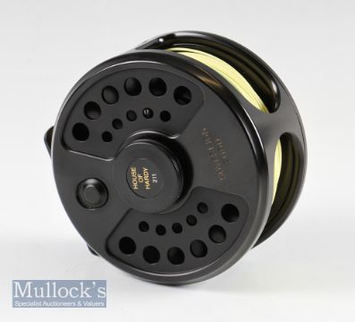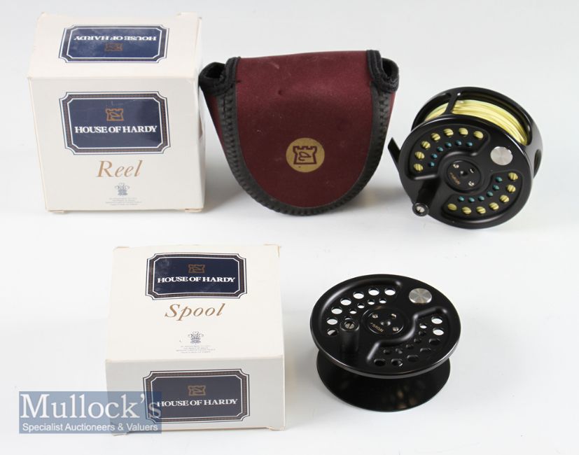 Good Hardy The Sovereign 9/10/11 Salmon fly reel c/w spare spool – 4” dia black finish, backplate disc drag adjuster, fitted with Partridge fly line – in maker’s neoprene reel pouch together with spare spool in makers cloth pokey bag – appear unused