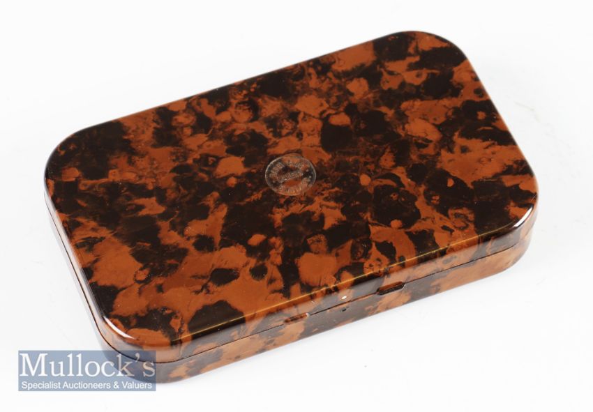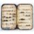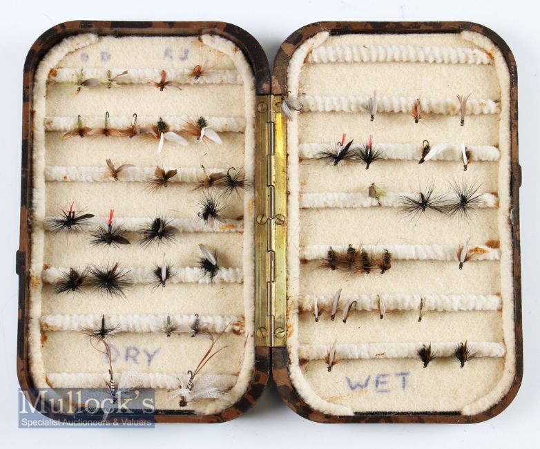 Hardy Neroda mottled red fly box with chenille interior, containing a good quantity of dry flies 6” x 3.75”