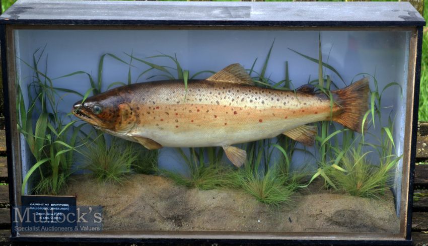 Preserved Cased Trout – in the original flat fronted glass case with half glass side panels similar to Norfolk taxidermists– c/w label inscribed “Caught at Britford, Salisbury, (River Avon) - Sept. 6th 1936 - 4lbs 2oz by F.R.B” overall 15.25” x 26.75”