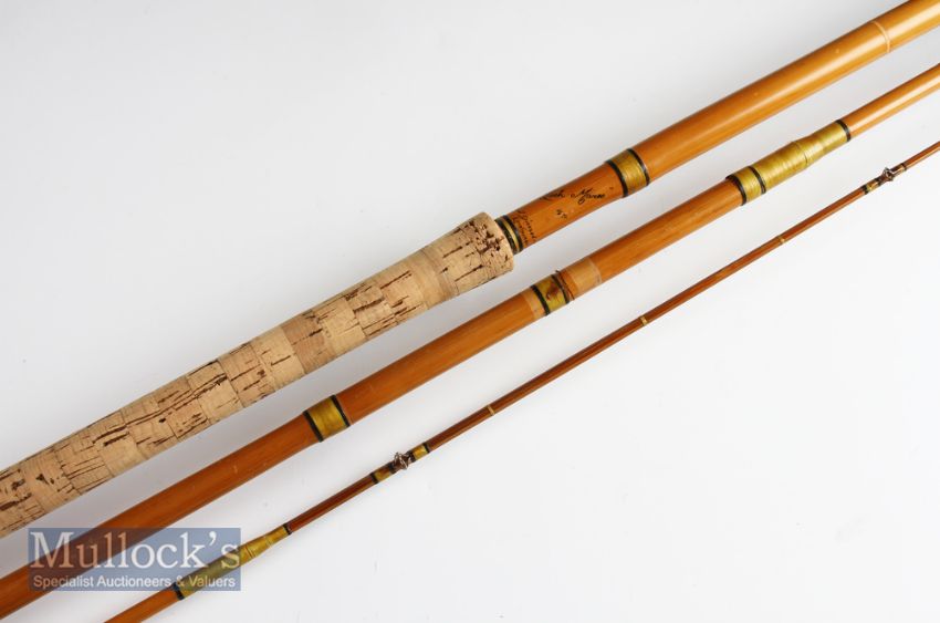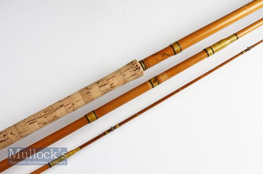 Interesting John Dickson & Son Edinburgh “Loch Maree” whole cane dapping rod – 14ft 3pc whole cane and spliced spilt cane with agate lined butt and tip guides – 28” cork handle c/w sliding alloy reel ring fittings – one guide missing, some whipping loose and some intermediates missing – comes in cloth bag – care needed when taking the rod in and out – some guides are loose