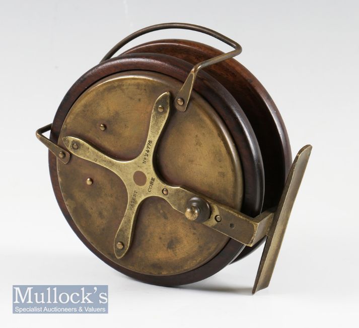 Scarce Patent Cone Reel No.24776, 5” mahogany/brass star back with brass recessed backplate, twin wood handles, wire line guide optional check button, smooth brass foot in a cloth bag