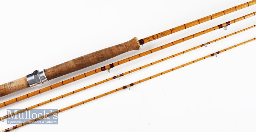 Good Hardy “The Wye” Palakona salmon fly rod-12ft 3pc ser. no. H426880-clear Agate lined butt and tip guides, screw locking ferrules, makers polished alloy screw locking reel fitting, soiled cork trumpet style handle and appears all original -some water leakage to the guide whippings-comes in the original MCB-very presentable and usable