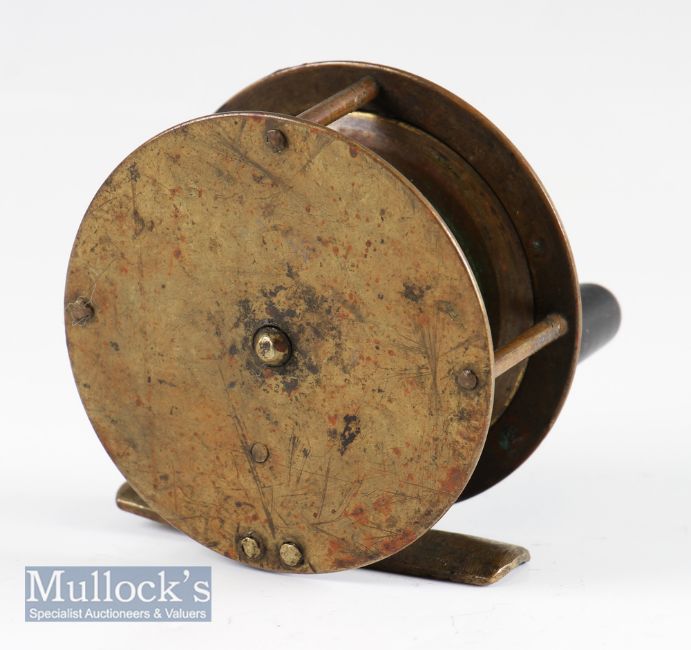 Scarce William Landell 105 Trongate Glasgow brass crank wind reel - 3”dia, with curved crank arm fitted with black handle, constant check, turns smoothly, knock to one end of the brass foot otherwise appears all original