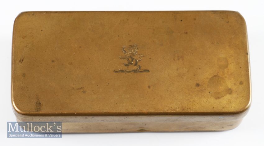Unusual hinged brass fly box - opens into 3 sections containing 18 flies having the family crest of a rampant lion to the lid 6” x 3”