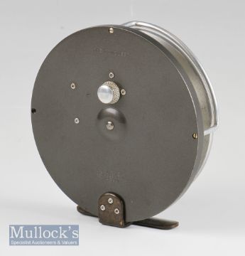 Hardy Conquest 4" alloy trotting reel, bright finish drum twin black tapered handles, faceplate wheel adjuster, line guide, correct brass foot, backplate retains moist original factory grey enamel finish, spins well.
