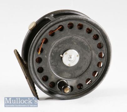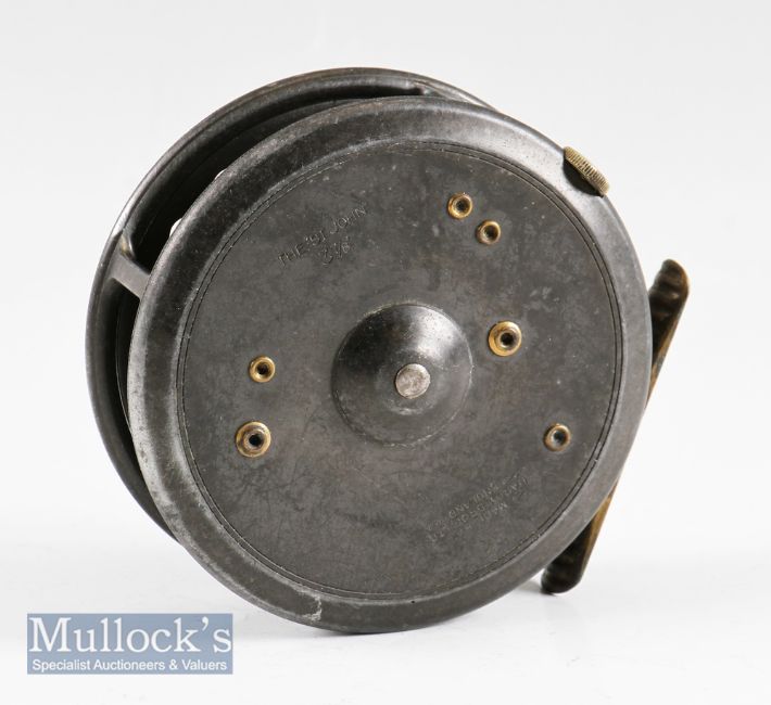 Hardy Bros ‘St John’ 3 7/8” alloy fly reel with 3 screw latch, rim tension screw, ribbed brass foot, light use apparent, with line, complete with maker’s box