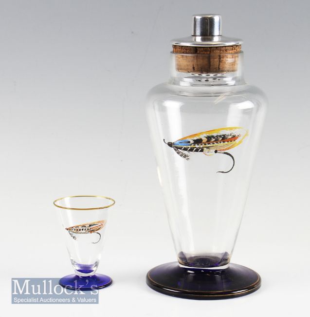 1930s Art Deco Hand Painted Glass Cocktail Shaker – 9.5” Tall with silver plated filter pourer and cap, hand painted fishing fly to clear glass body with a heavy cobalt blue 4” round base together with a matching 3” tapered glass (2)