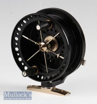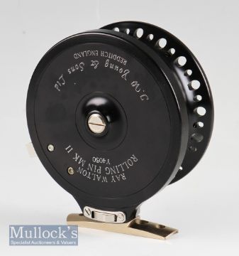 J W Young Ray Walton Rolling Pin MK2 Reel, 3.75” diameter, anodised black alloy, twisting foot, 6 spoke Aerial style deep drum with tension regulator, end plate ratchet lever, as new with papers, COA no 1124 dated May 2011, fitted makers case and outer box.