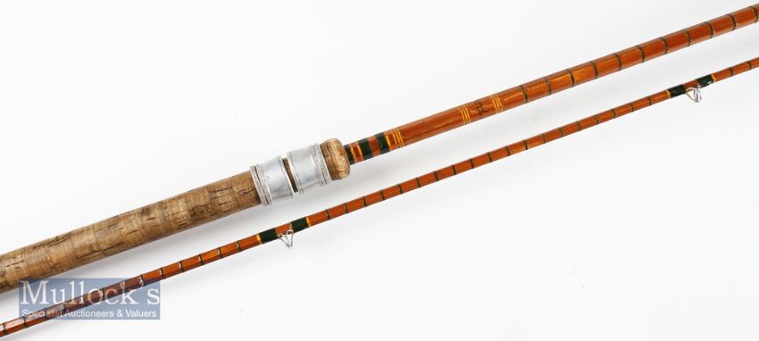 Good “Guaranteed Hand Built” B James style Avocet rod – 11ft 2pc with red agate lined butt and tip guides, 25” cork handle (soiled) with sliding alloy reel fittings, in a cloth bag with Bruce & Walker balck and gold cloth label.
