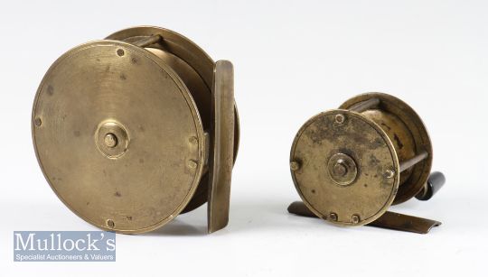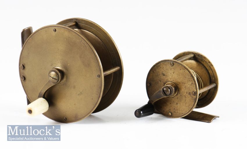 Fine Vic 3.25” brass crank wind reel stamped with J Warner & Son fish logo trademark – curved crank arm with ivorine handle - slight off centre foot – fine check – and runs smoothly; and small unnamed 2” brass crank wind reel with horn handle – 2x pin brass foot- no check – turns freely (2). (The Late John Snelson Collection)