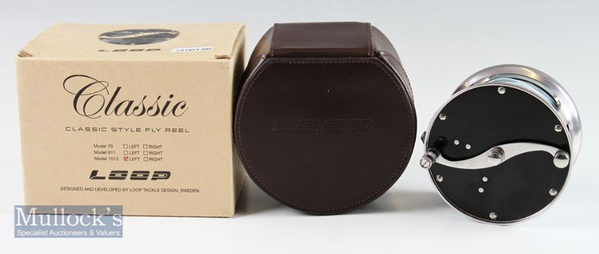 Fine Loop Classic 1013 Cascapedia style salmon fly reel and reel case - housing and spool in stainless steel and anodised aluminium, counter balanced handle c/w Carron F line and comes in makers handcrafted leather fitted reel case – again appears unused .