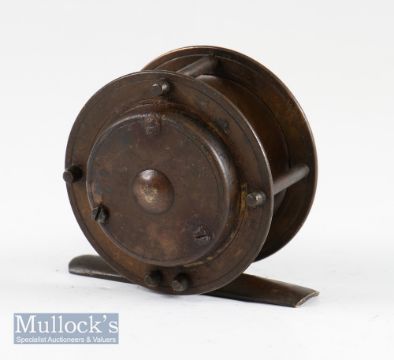 C Farlow & Co 191 The Strand London Vic. brass crank wind fly reel c.1890 - 2.25” dia - good straight foot with very slight filing to both ends, raised check housing, curved crank arm, slight pitting to one screw - otherwise runs freely(The Late John Snelson Collection)