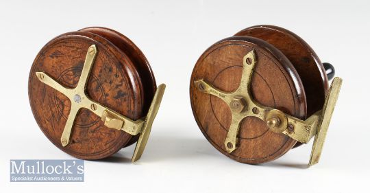 2x Wooden Nottingham Brass star back reels – Eton Sun 4” wide drum with rear brass plate, brass lined back plate rim, wing nut tensioner runs smoothly; and 4” slightly dished face narrow drum with brass slater style drum release latch, on/off check button – spins freely (The Late John Snelson Collection)