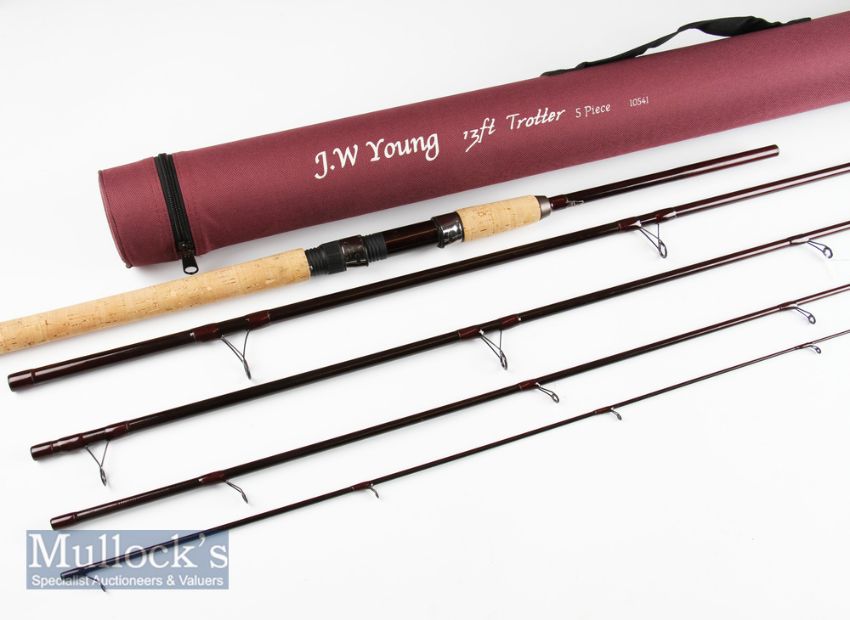 Fine J.W Young Trotting Travel Rod - “The Trotter 13 foot 5 piece carbon rod 24 inch shop soiled cork handle with carbon reel seat with Fuji style screw locking winch fittings in a handmade red cloth bag and makers cordura rod tube appears unused