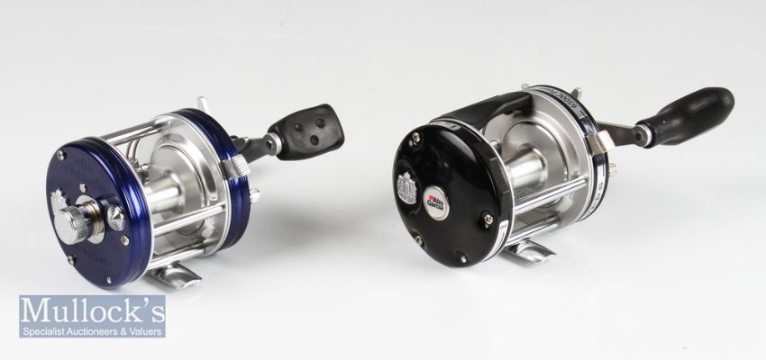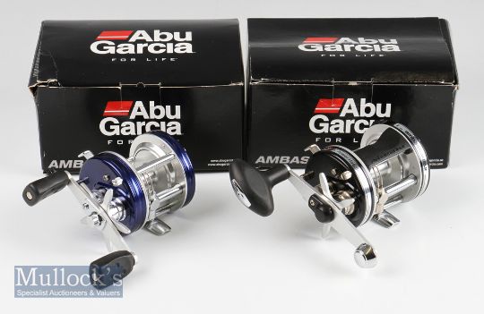 Abu Ambassadeur Classic 6500C multiplier reel, in little used condition, foot stamp O1E13SE, 3 screw end plate, level wind, star drag, c/w handbook, mob together with Abu Ambassadeur Rocket 5500C high speed multiplier, blue finish, 3 screw smooth end plate, foot stamp 0012SE, single black handle, free spool, handbook, mob both unused (2)