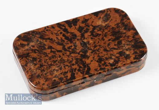 Hardy Neroda mottled red fly box with chenille interior, containing a good quantity of dry flies 6” x 3.75”
