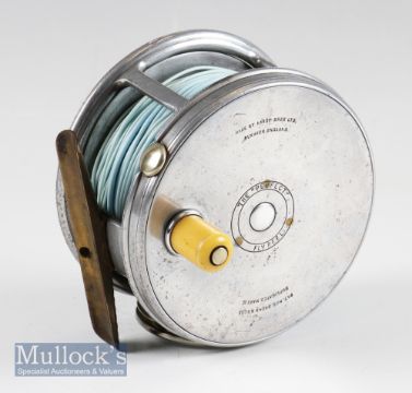 Fine Hardy The Perfect Dup Mk II alloy salmon fly reel – 4.25” dia, ribbed brass foot, nickel revolving line guide, fat stubby handle c/w Carron fly line – runs smoothly and regularly maintained by the present owner