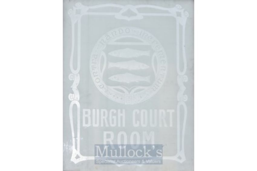 Scarce Scottish Court Heavy Glass Door Panel decorated with Fish: from the Peebles Courtroom with acid etched Crest comprising three fish and motto “Contra Nando Incrementum” – translated means “Against The Stream They Multiply” – with “The Burgh Court Room” below - mounted in wooden frame - panel measures 36.5 x 28” – small chip to one corner