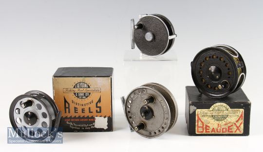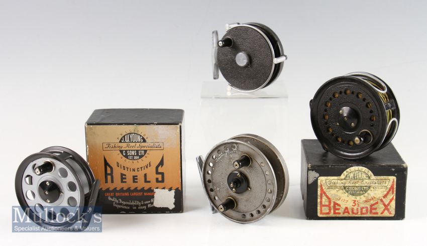 4x various J W Youngs trout fly reels - fine and unused The Pridex 3.25” in makers original box; Beaudex 3.5” c/w dual alloy line guard, line and comes in original box appears unused (VG): The Valdex 3” with dual line guard – some rim wear (G); and The Seldex 3.5” with some rim wear and face wear come with Shakespeare padded reel case – all run smoothly